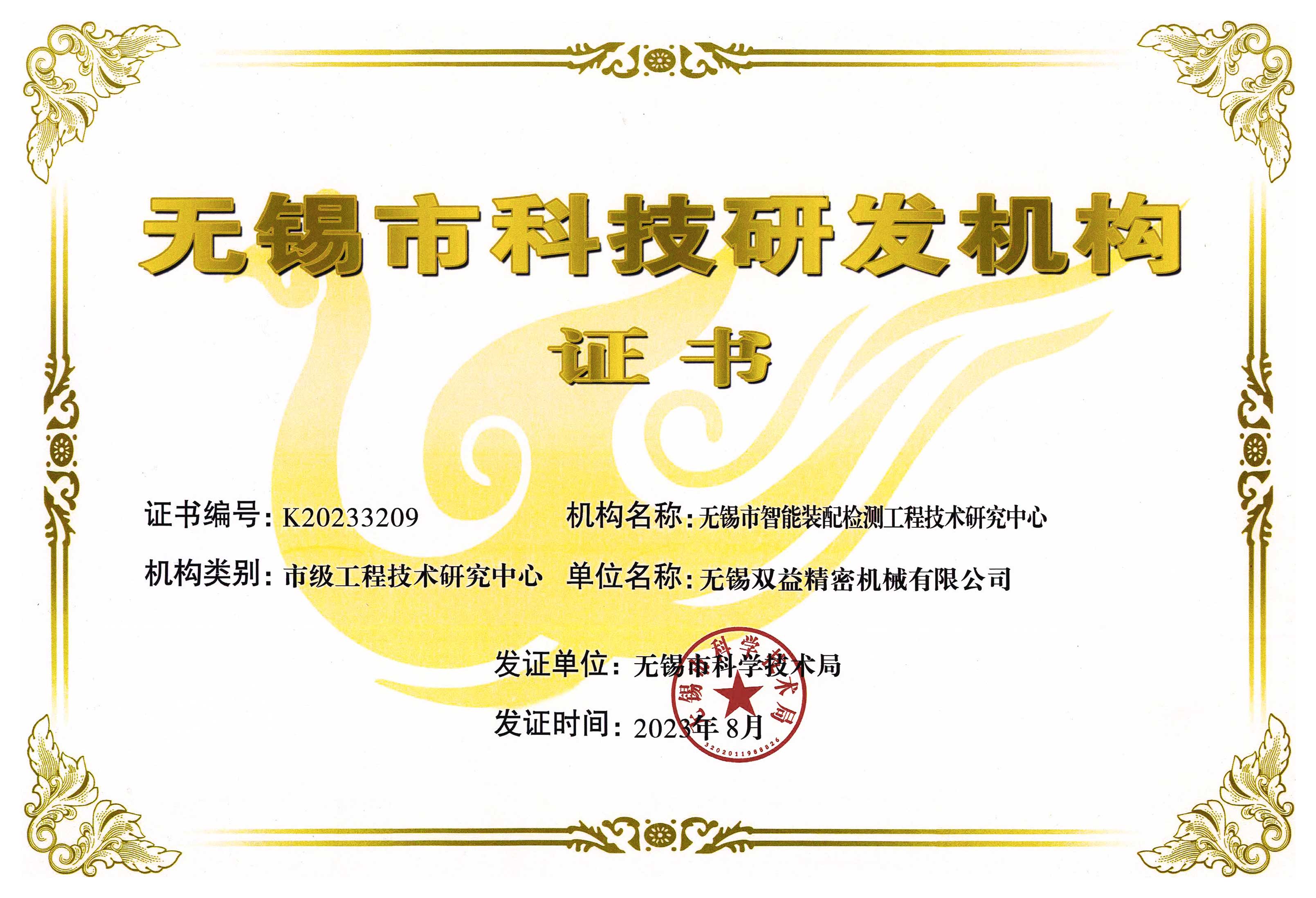 雙益精機高度重視品質管理,已通過 S G S公司的質量體系認證 ISO9001:2015、TUV公司的環境體系ISO14001:2015,職業健康安全 管理體系ISO14001:2015,能源管理體系IS050001:2018,以及知識產 權管理體系,為客戶提供安全、優質的產品。同時,公司多次被評選為 江蘇省民營科技企業,并獲得江蘇省人民政府授予的《高新技術企業》 稱號。此外,雙益精機兩次榮獲浙江省科學技術進步二等獎,獲得江蘇 省專精特新企業稱號,同時被認定為市級企業技術中心和市級工程技 術研究中心,并被認定為市級保密試點單位。